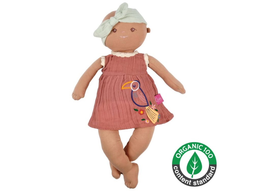 Hra s bábikou rozvíja okrem jemnej motoriky aj schopnosť pomáhať, vcítiť sa, posilňuje vrodený cit pre starostlivosť a cez hrané príbehy napomáha rozvoju fantázie a predstavivosti. Keďže malé deti ešte nevedia vyjadriť svoje emócie slovami, často ich vyjadrujú práve prostredníctvom hry s bábikami, kam prenášajú kúsok svojho vlastného sveta. Jednoduchá bábika bez špeciálnych funkcií, bateriek a príslušenstva neobmedzuje detskú fantáziu a dáva dieťaťu najväčší priestor na sebavyjadrenie. Príjemne mäkká organická BIO bavlna. Precízna ručná práca, kvalitné vypracovanie. Šaty sa dajú vyzliekať, pod šatami má bábika plienočku. Bábika je príjemne mäkká a preto je vhodná aj na túlenie a na spanie. Bezpečné aj pre najmenších. Testované podľa EU noriem. Zloženie:Telo a oblečenie – 100% certifikovaná organická BIO bavlnaVýplň – recyklované vlákno z PET fliaš.Výška cca 45 cm.Vhodné od narodenia.Vyrobené na Srí Lanke vo fair trade podmienkach.Varianty:Kaia – modré šatyAria – tehlové šaty Ako vznikla Bonikka Bonikka sa zrodila na Srí Lanke z rodinnej tradície, ktorá vznikla v roku 1895 z jednoduchého skutku s obrovským významom. Otec daroval svojej dcére, ktorá odišla z domu, aby si založila vlastnú rodinu, porcelánovú bábiku na rozlúčku. Bábika jej mala pripomínať, aké pevné je puto rodiny, aká nekonečná je láska a podpora rodičov. Odvtedy táto bábika putovala generáciami a pripomínala ženám tieto dôležité hodnoty. Mano – dnešná riaditeľka rodinnej fabriky na výrobu hračiek DSL Lanka – dostala toto vzácne dedičstvo darom od svojej mamy. Odkaz, ktorý toto gesto nieslo, bol pre ňu tak silný, že sa roky neskôr rozhodla sprostredkovať ho oveľa mladším deťom – dievčatám a chlapcom, ktorí sa práve učia pochopiť kým sú, kam patria a čo pre nich znamená okolitý svet. A tak Mano vytvorila radu výnimočných bábik vyrobených dôkladnou ručnou prácou, zo zdravých prírodných materiálov a nazvala ich Bonikka, čo v Sinhalčine znamená „bábika“.Dodatočné parametre